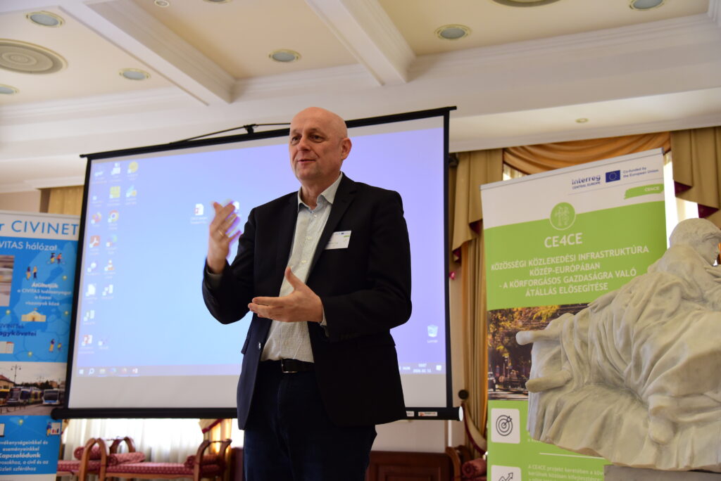 Dr. Ádám Zoltán Németh, Head of Public Transport and Rail Safety at SZKT, talked about the pilot projects in Szeged within the CE4CE project. He emphasized that the purchase of used vehicles in Szeged was driven by necessity rather than a commitment to the circular economy.
